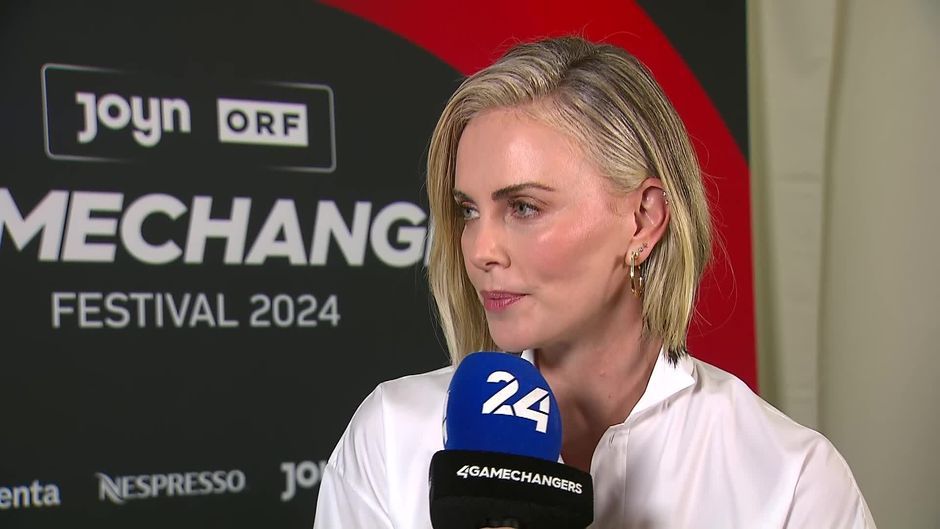 Schauspielerin Charlize Theron spricht am 4GAMECHANGERS Festival 2024 mit PULS 24 Chronik-Chefreporterin Magdalena Punz.