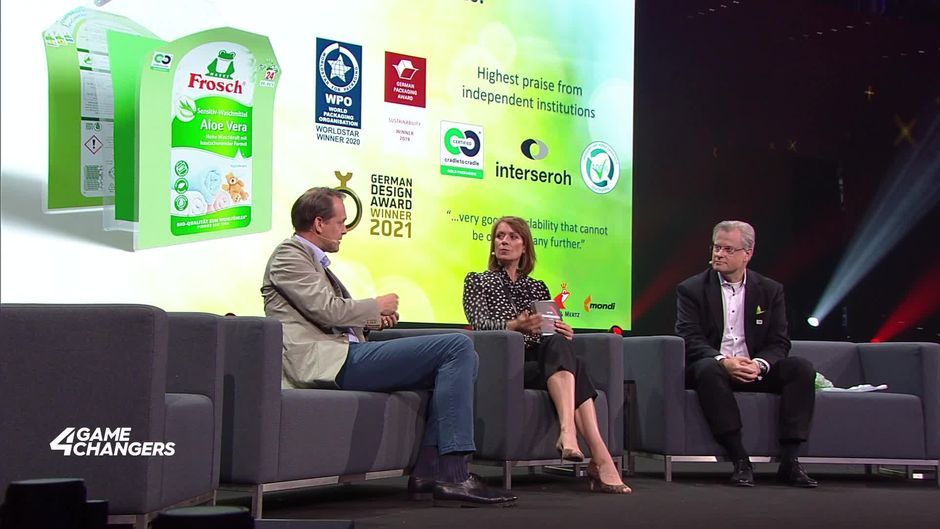 Reinhard Schneider, Gründer Werner & Mertz, und Paulus Goëss, Sustainability & Customer Solution Director Mondi Group, im Fireside Chat beim 4GAMECHANGERS Festival 2024.