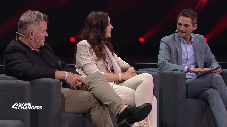 Der Schauspieler Cornelius Obonya, die "Sky Austria"-Anchorwoman Constanze Weiss und die Schauspielerin, Sängerin sowie Unternehmerin Jasmin Wagner alias Blümchen diskutieren auf dem 4GAMECHANGERS Festival 2024.