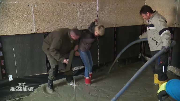 Der Boden der Nussbaums wird mit Zement ausgelegt. Auch Sandra will mithelfen und stellt sich mit ihren Gummistiefeln mitten ins Getümmel.