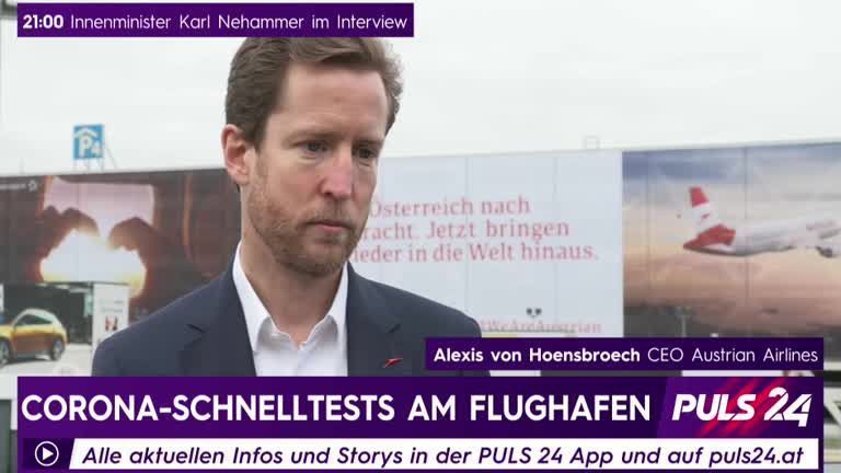 PULS 24 Reporterin Barbara Piontek hat mit AUA-Chef Alexis von Hoensbroech über die Schnelltests am Flughafen Wien Schwechat gesprochen.