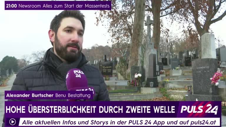 Alexander Burtscher von der Bestattung Benu in Wien, erklärt im Gespräch mit PULS 24 Reporterin Nadja Buchmüller, wie sich die deutlich gestiegene Sterblichkeit in der zweiten Corona-Welle auf sein Unternehmen auswirkt.