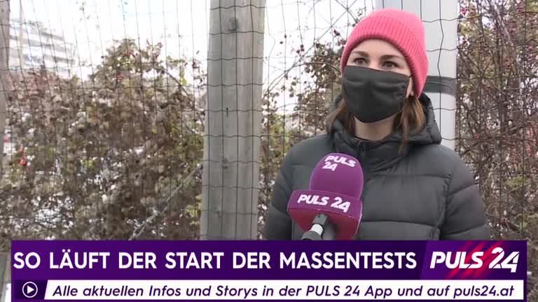 PULS 24 Reporter Christoph Isaac Krammer befragt Menschen nach ihrer Testung in der Wiener Marx-Halle über ihre Eindrücke vom Corona-Massentest.