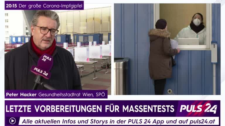 Wiens Gesundheitsstadtrat Peter Hacker (SPÖ) erklärt im Interview mit PULS 24 Chronik-Chefreporterin Magdalena Punz, dass die Stadt Wien für eine Massentest-Beteiligung von 60 Prozent vorgesorgt hat. Man könne aber nicht abschätzen, wie diese tatsächlich ausfällt.