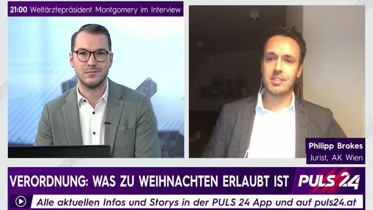 Philipp Brokes, Jurist bei der Arbeiterkammer Wien, analysiert im Gespräch mit PULS 24 Anchor René Ach die Corona-Verordnung für die Weihnachtsfeiertage.