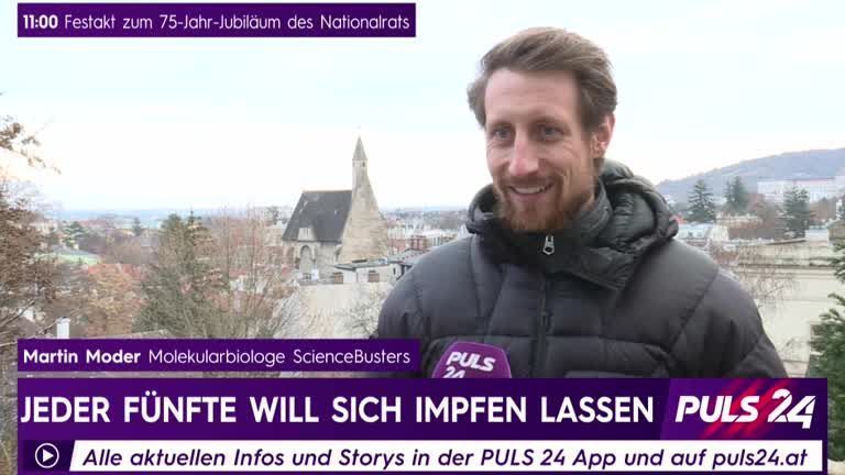 Der Molekularbiologe Martin Moder von den "Science Busters" im Interview mit PULS 24 Reporterin Bettina Häberlin über die möglichen Nebenwirkungen einer Corona-Impfung.