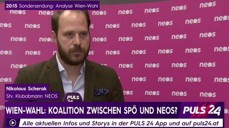 Die NEOS erreichen nach aktuellem Auszählungsstand 7,8 Prozent und möchten in Wien mitregieren. Nikolaus Scherak, stellvertretender Klubobmann der NEOS, spricht mit PULS 24 Reporterin Barbara Piontek über das Ergebnis bei der Wien-Wahl und über mögliche Koalitionsbedingungen.