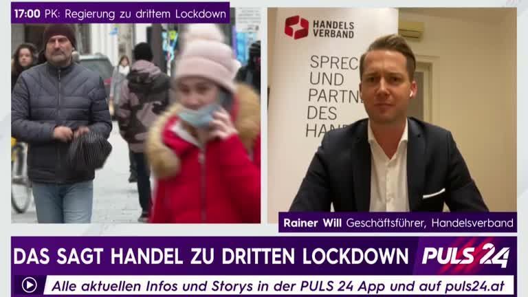 Handelsverband-Geschäftsführer Rainer Will spricht mit PULS 24 Anchor René Ach über den bevorstehenden dritten Lockdown und wie der Handelsverband dazu steht.
