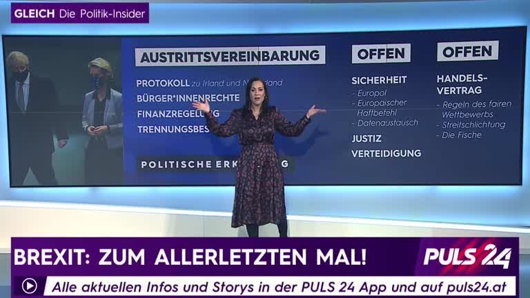 Am 31. Dezember endet die Übergangsphase und Großbritannien scheidet aus dem EU-Binnenmarkt aus. Bislang gibt es kein Handelsabkommen. PULS 24 Politik-Chefreporterin Manuela Raidl erklärt Ihnen alles was Sie zum "Brexit" wissen müssen.